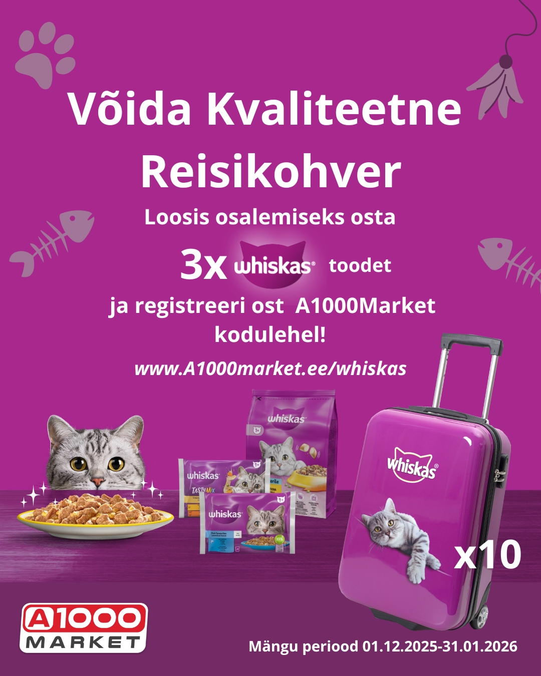 • osta vähemalt 3 mistahes Whiskasi toodet A1000 Marketi poodidest;
